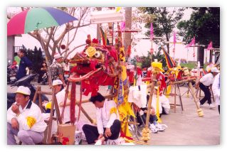 註21:所謂「請水」就是神明前往溪流或海邊掬水為聖的意思,意寓「飲水思源」;「請火」則是神明回到祖廟進香,刈取母廟祖爐的香火合於己廟的香爐中,以增加神力。
